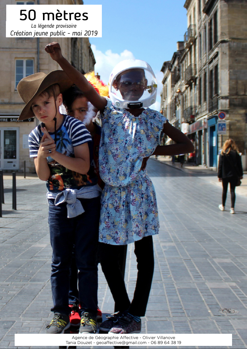 50 mètres, la légende provisoire![]() pour toute la famille Création jeune public 2019 La nouvelle création jeune public de l’Agence de Géographie Affective souhaite interroger la place de l’enfant et de ses trajectoires dans l’espace public. Création : 2019 Coproducteurs : Bourse Beaumarchais / SACD - Aide à l’écriture Arts de la rue , Théâtre le Liburnia - Libourne (33), Festival Chahuts - Bordeaux (33), Théâtre le Strapontin - Pont-Scorff (56), Fabrique des arts de la rue Hameka - Louhossoa (64), Le Fourneau - Centre national des arts de la rue et de l’espace public de Bretagne (29), Le Collectif Créa’Fonds, Fabriques RéUniES - Sur le pont - Centre National des Arts de la Rue et de l’Espace Public en Nouvelle-Aquitaine (17), Effervescences, Clermont métropole (63), Le Sillon – Clermont l’Herault (34) / L’Atelline – Montpellier (34), OARA – Office Artistique de la Région Nouvelle-Aquitaine, l’IDDAC – Institut Départemental de Développement Artistique et Culturel – Agence culturelle de la Gironde, La Direction Régionale des Affaires Culturelles – Drac Nouvelle-Aquitaine. L’Agence de Géographie Affective est soutenue par la Région Nouvelle Aquitaine, le Département de la Gironde et la Ville de Bordeaux. Mise en scène : Géographie affective |